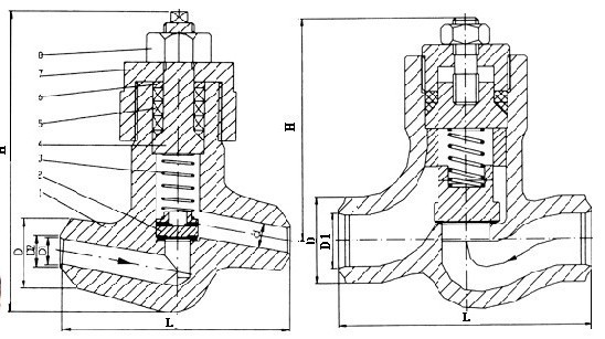 2.閥體、閥蓋均為模鍛件。閥瓣整體淬火,并能在閥體內上下移動,介質倒流時,借介質壓力自動將閥瓣關閉。